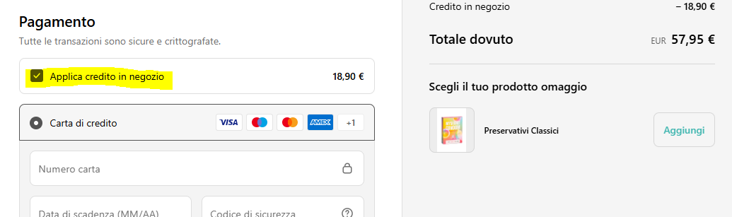 Ora puoi inserire i prodotti che vuoi a carrello e procedere con il tuo ordine. Inserisci normalmente le informazioni dell'indirizzo e del metodo di consegna che preferisci; nella pagina del Pagamento troverai la possibilità di usare il tuo credito: