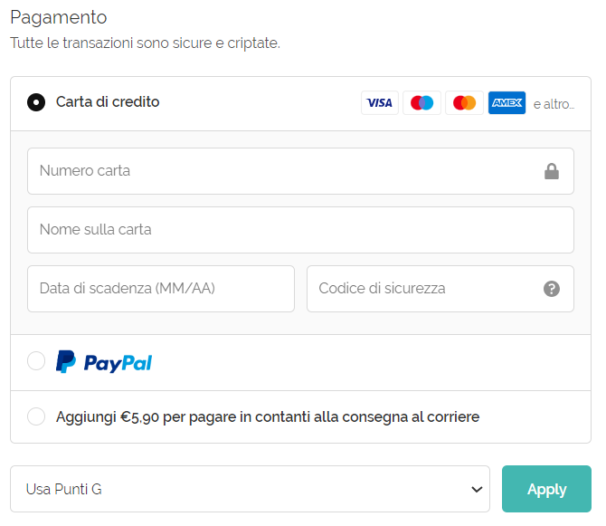 Se hai accumulato Punti G, al checkout del tuo ordine superiore a 50 € troverai una sezione apposita per indicare se vuoi usare i Punti a tua disposizione oppure no. Ricordati di cliccare il tasto "Applica", per confermare lo sconto e scalare l'importo dal totale dell'ordine!